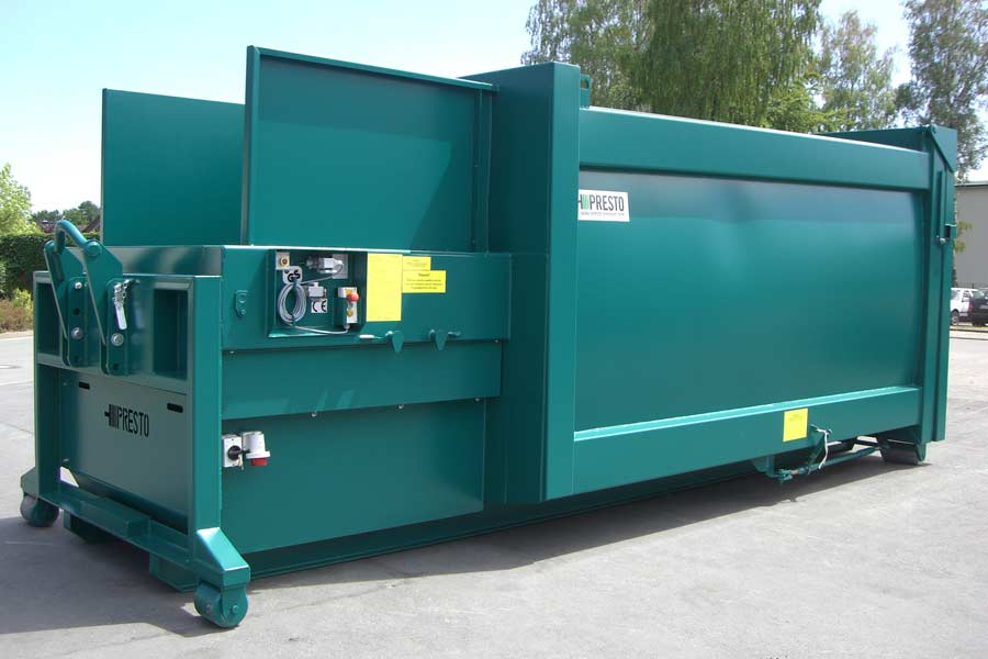 PRESTO Wet waste compactors are used to dispose of large quantities of moist or very wet residual waste or commercial waste that is similar to household waste. As in all other systems, the PRESTO wet waste compaction container is firmly attached to the container. The material is compacted by a pendulum compaction plate with an electro-hydraulic drive system.