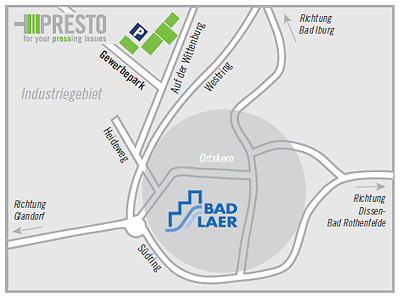 Salida intersección Ladbergen > derecha hacia la B 475 dirección Glandorf / Ladbergen / Saerbeck. > pase por 3 rotondas > B 51 dirección Bad Iburg (rotonda) > girar a la derecha a la L 94 dirección Bad Laer > en la rotonda la tercera salida al Westring dirección Bad Iburg > primer cruce a la izquierda y en seguida a la derecha al polígono industrial. En el Polígono Industrial «Auf der Wittenburg/Gewerbepark» encontrará PRESTO al final de la calle «Auf der Wittenburg», a la izquierda.